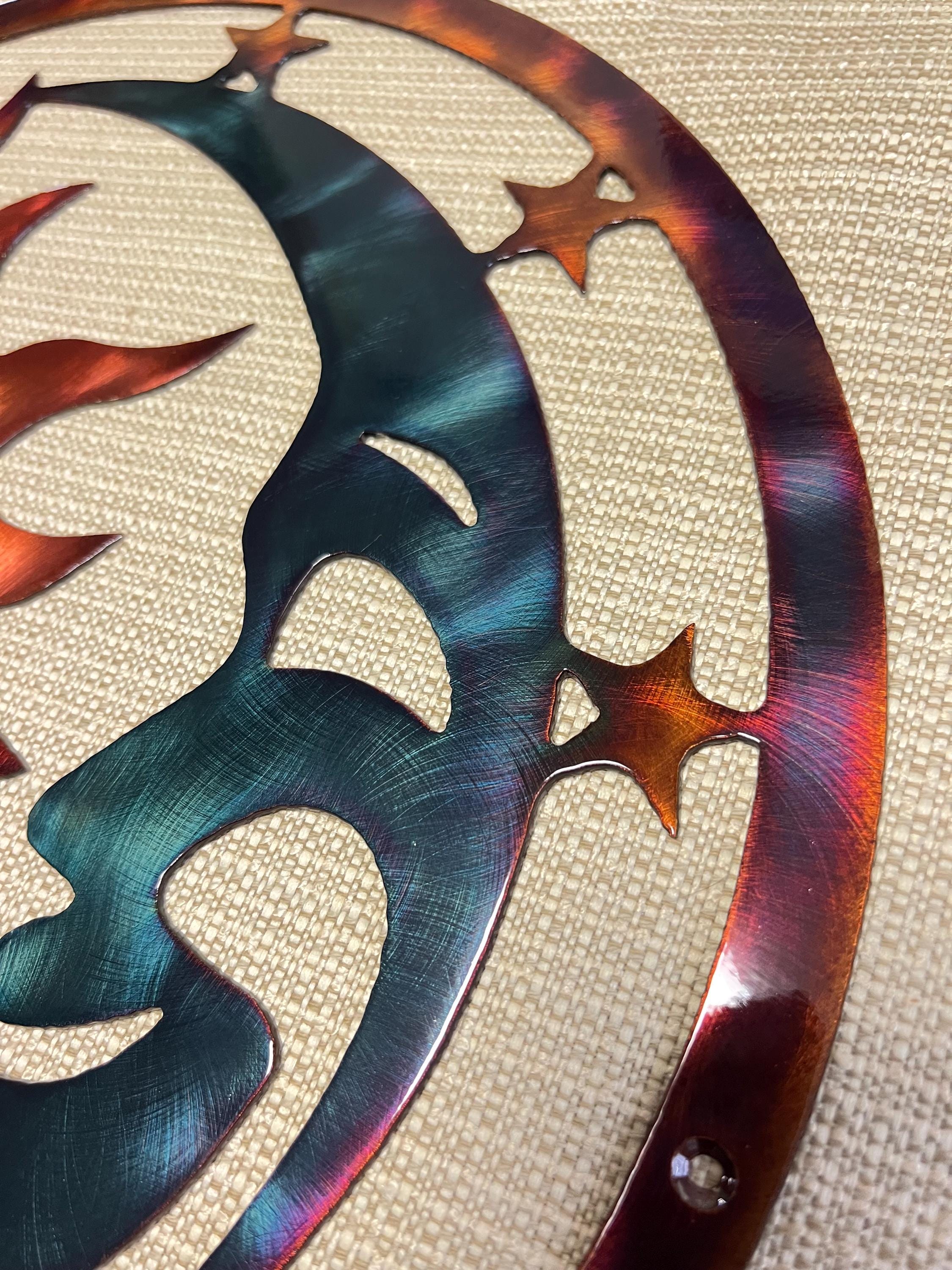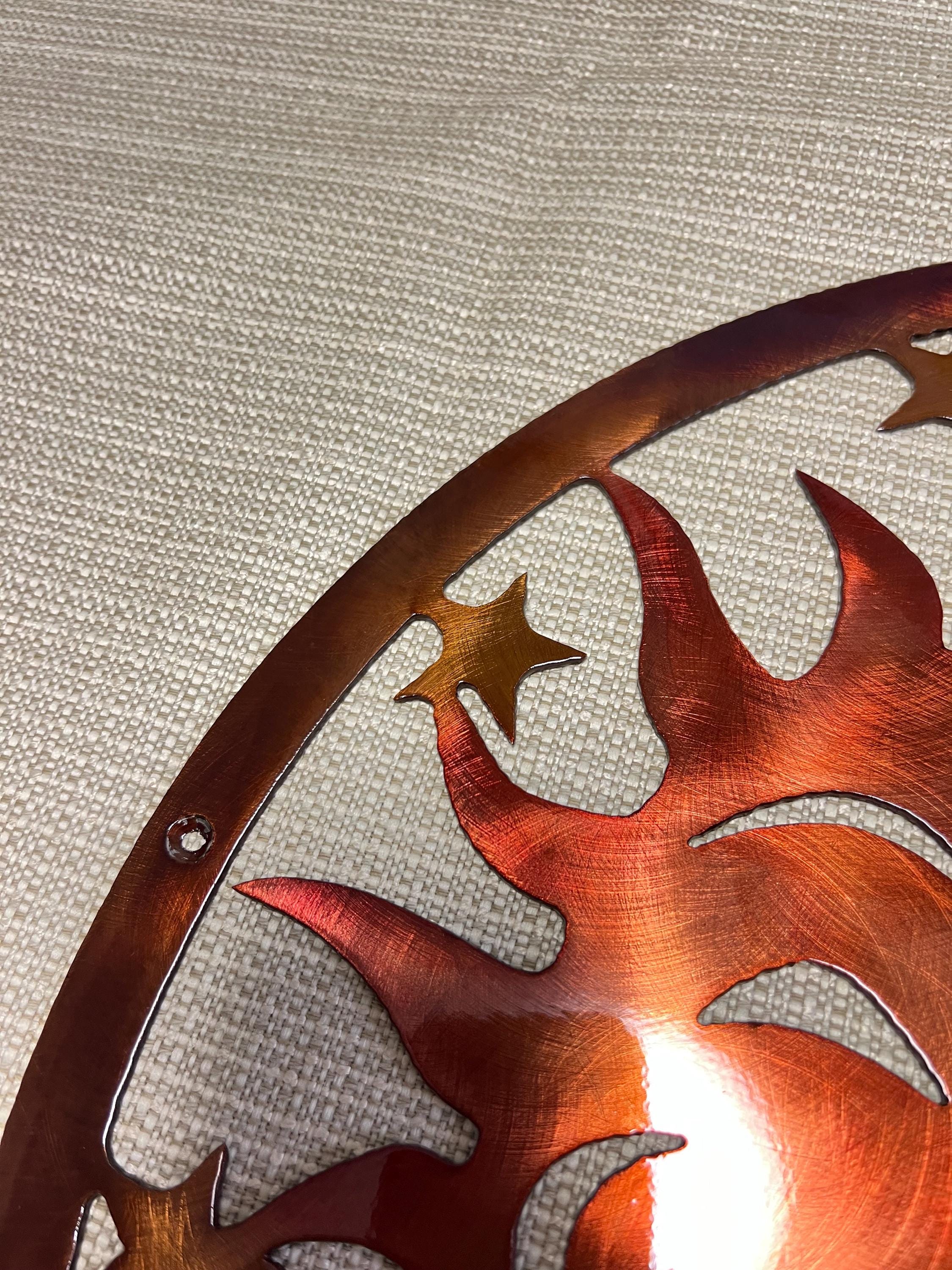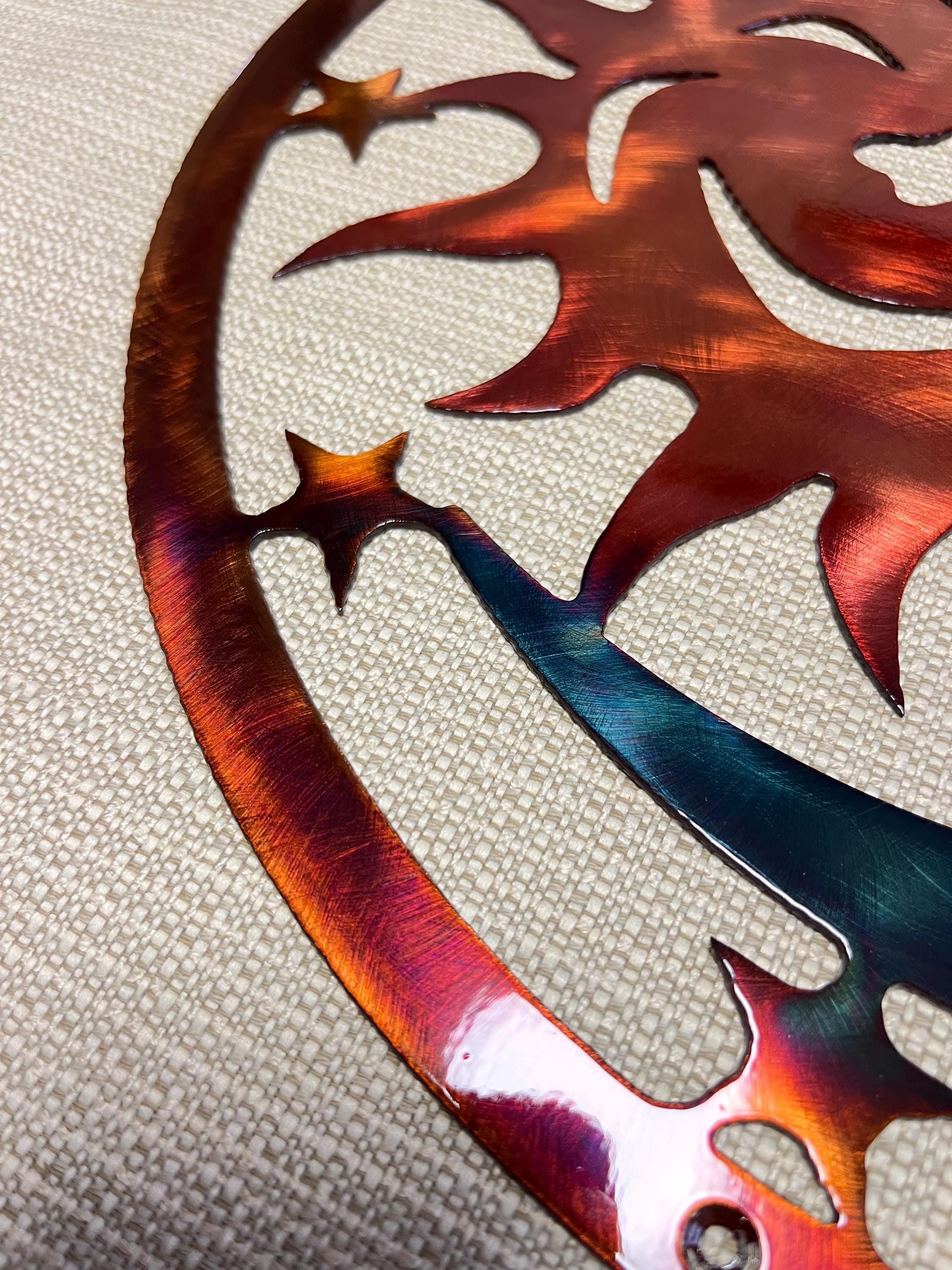 Each piece is made from heavy-duty 14-gauge steel and finished with a hand-applied copper patina enhanced with alcohol dye colors. The finish is sealed with a durable clear powder coat, allowing the artwork to withstand the elements while maintaining its vibrant tones. The colors subtly shift depending on lighting and viewing angle, making every piece unique.