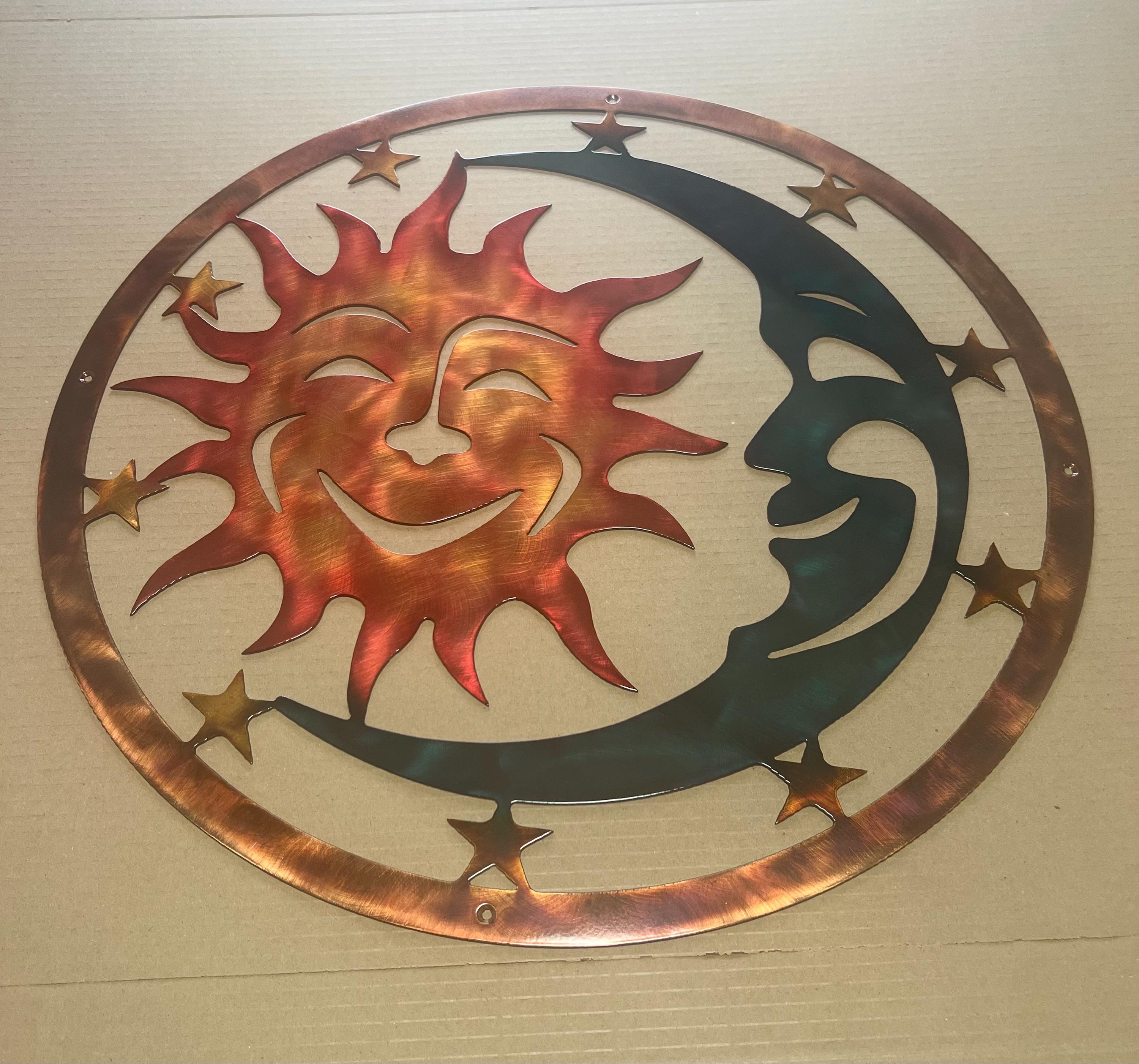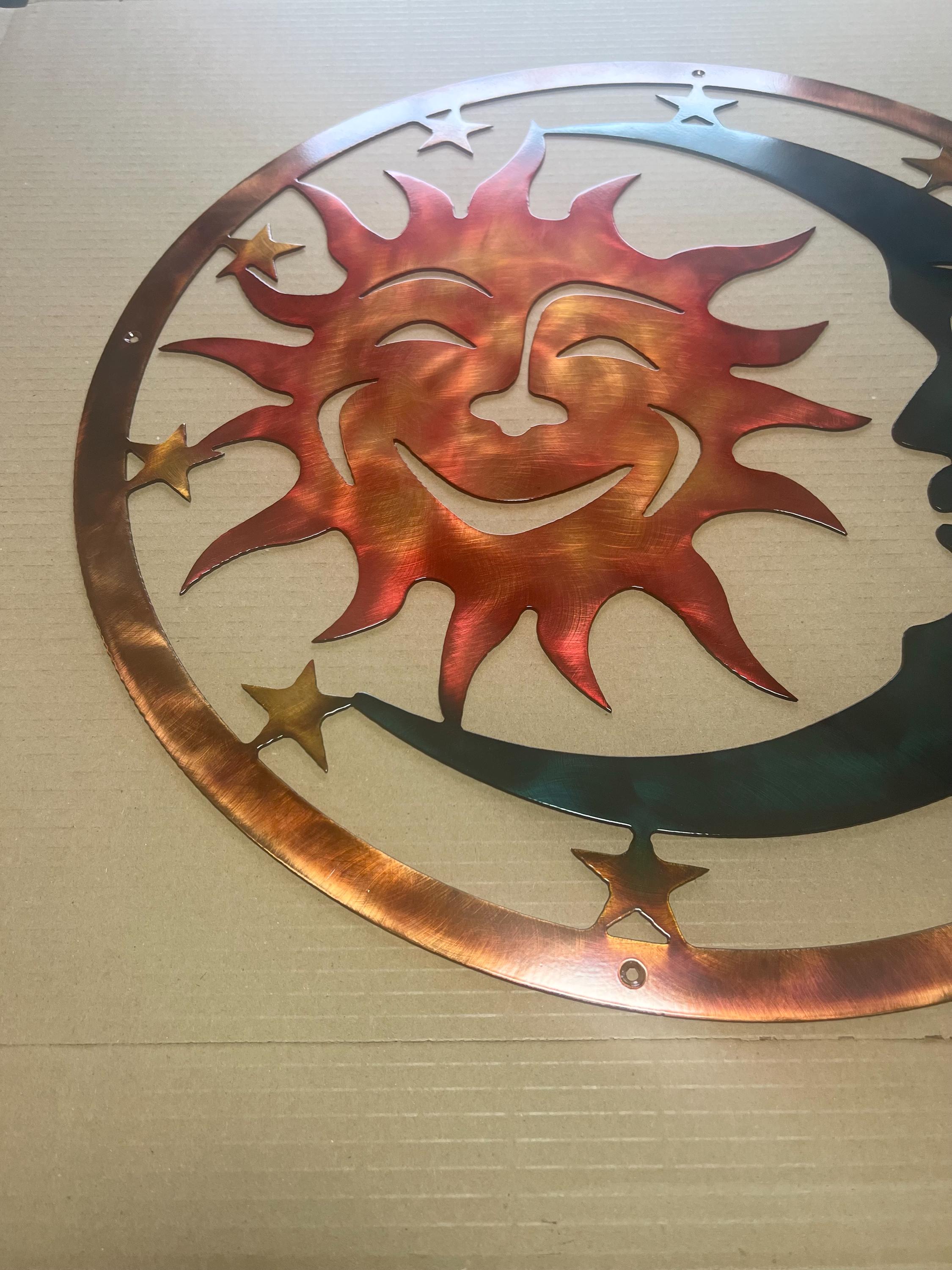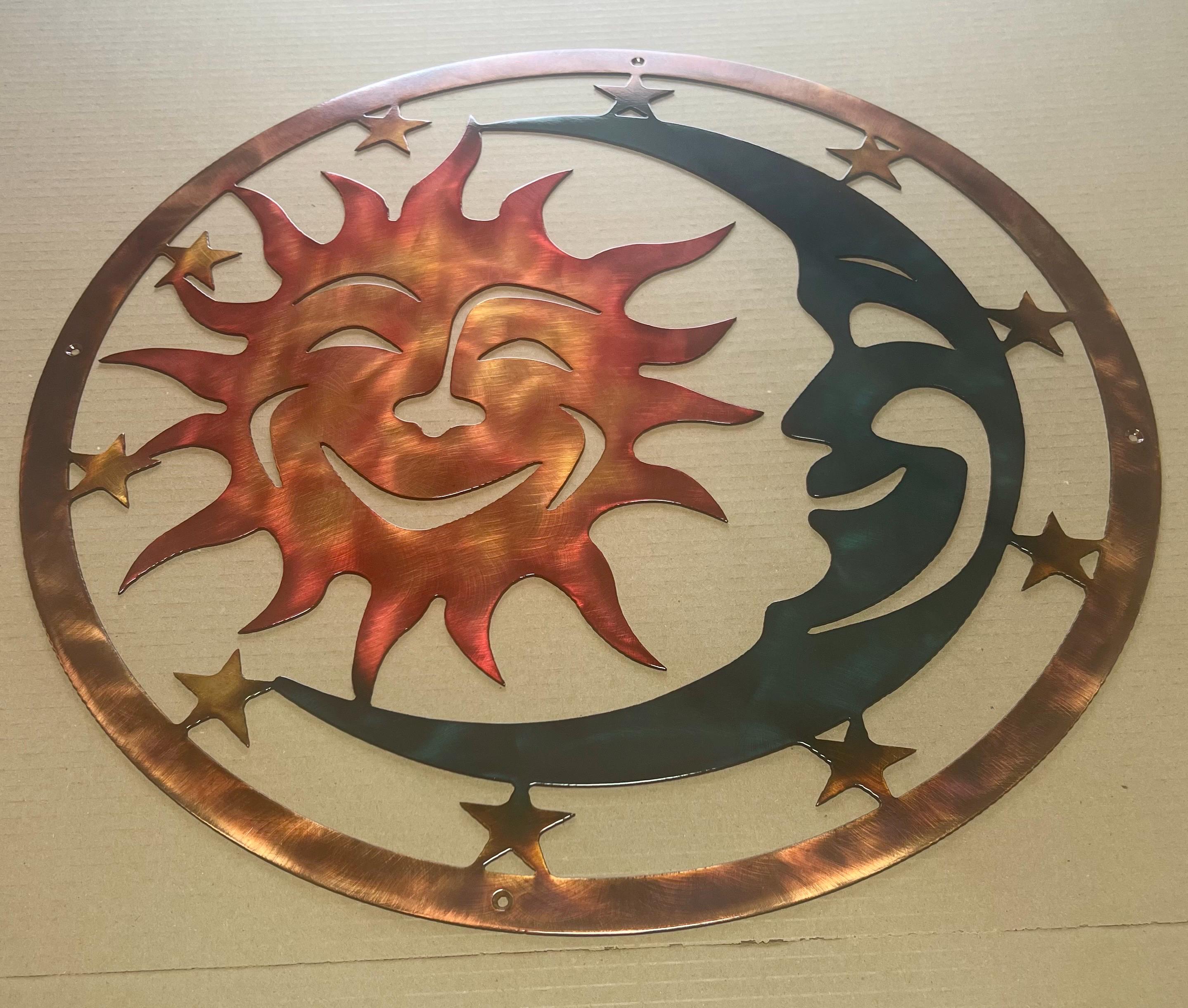 This indoor or outdoor metal wall art piece features the celestial bodies with a sun and half moon surrounded by stars. The patina color is hand applied and protected by a durable baked on gloss clear powder coat. The colors will appear to change depending on the color, angle and intensity of the surrounding light.