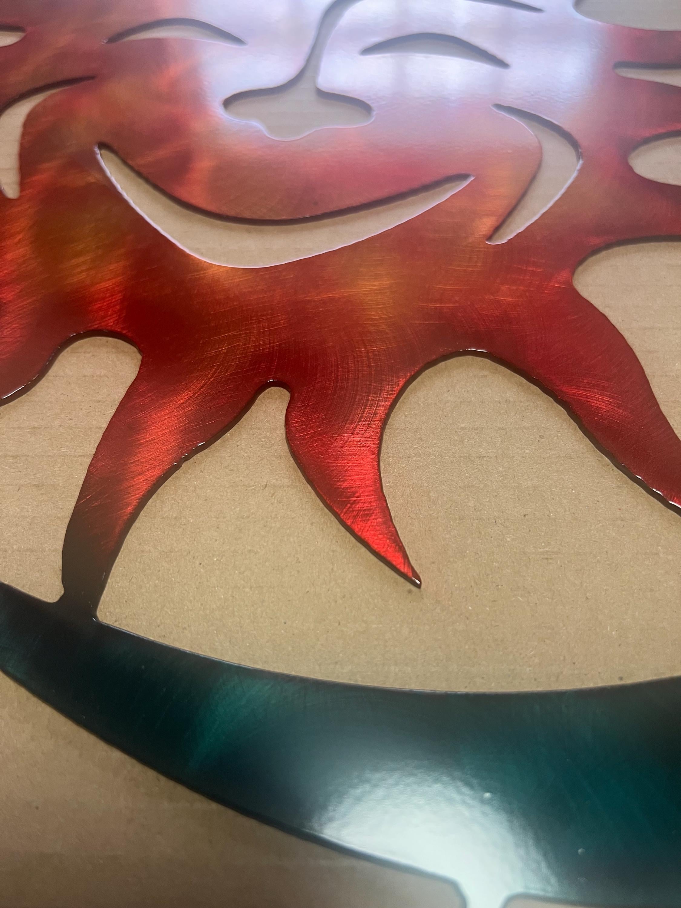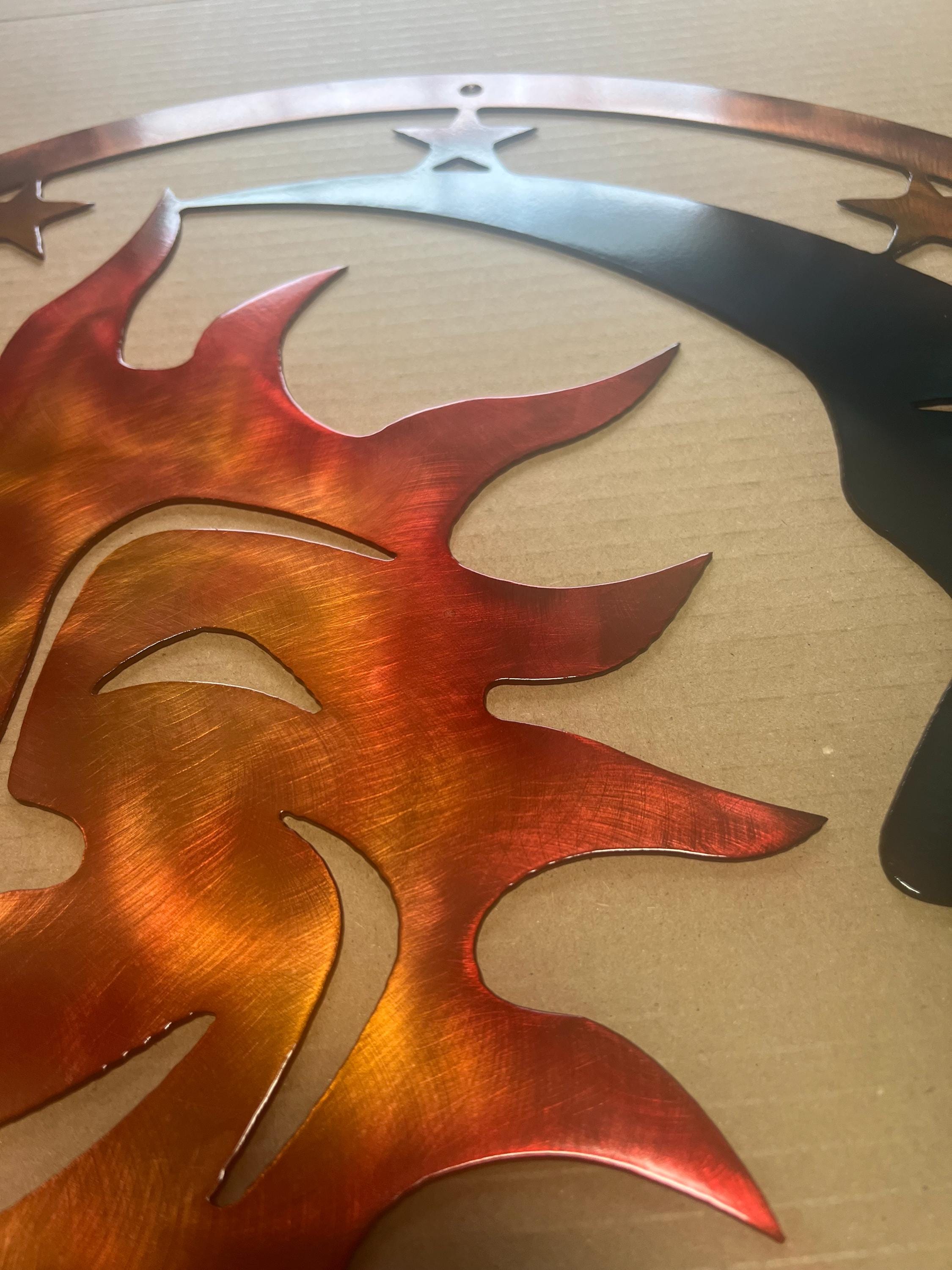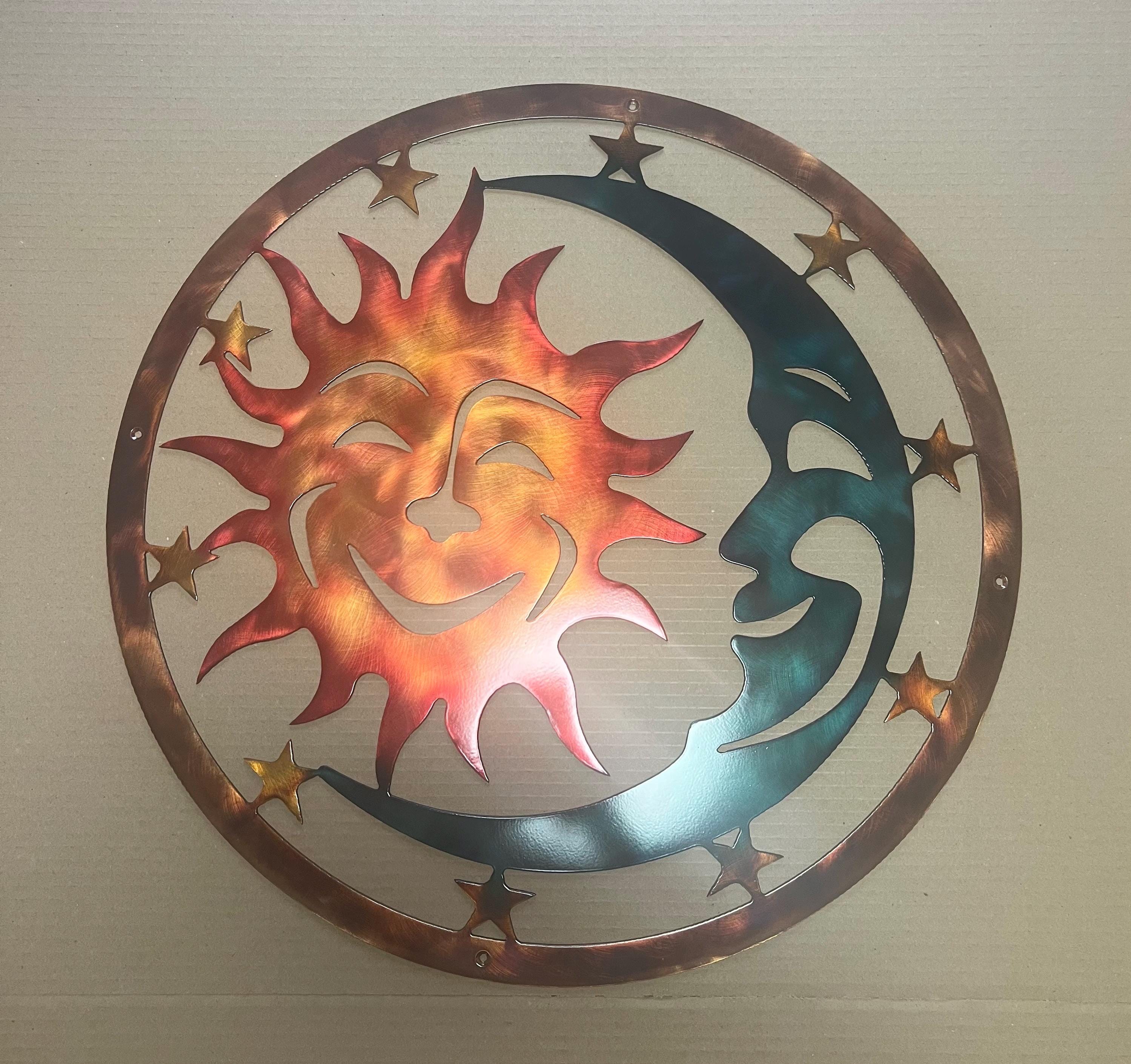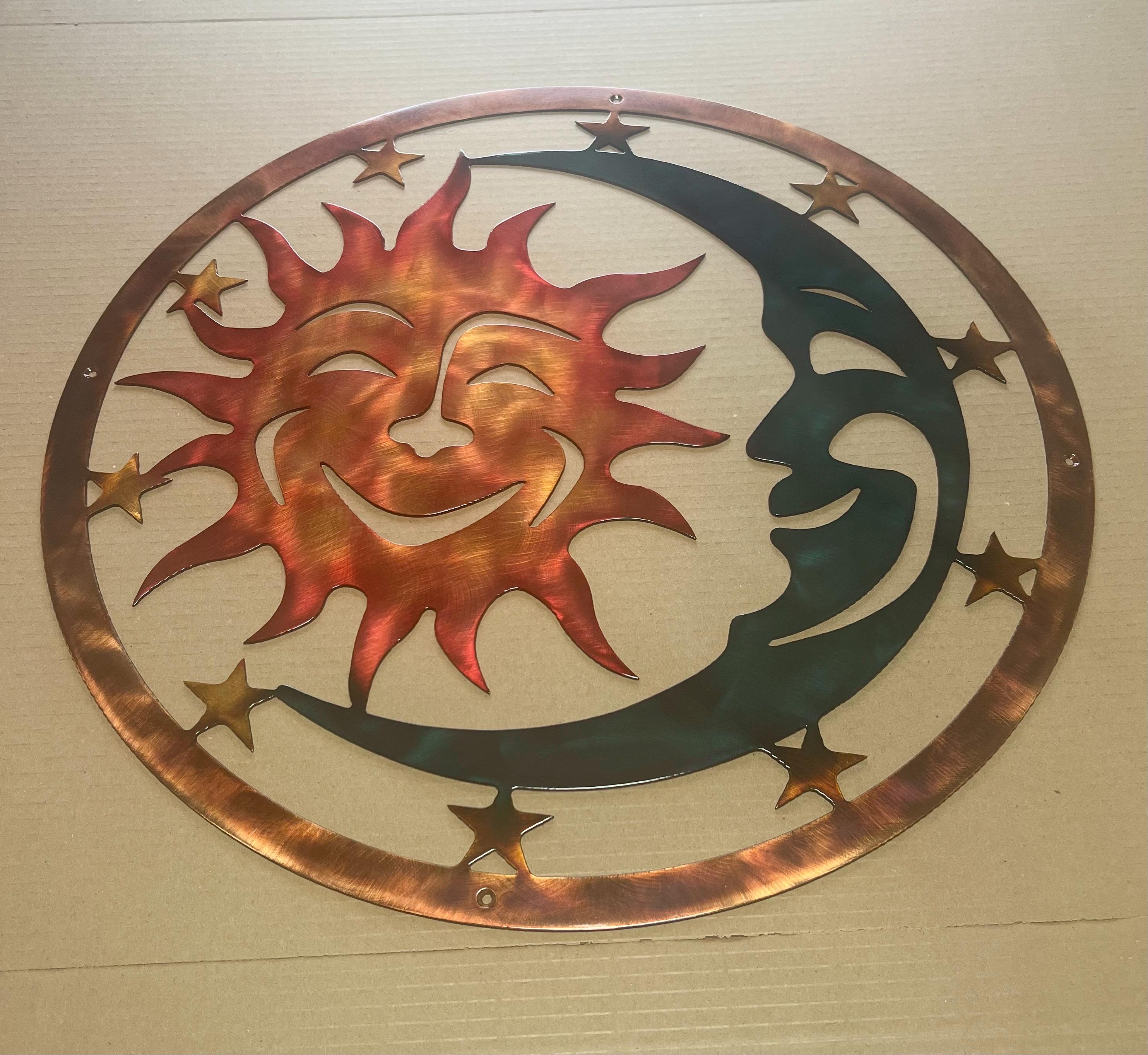 This indoor or outdoor metal wall art piece features the celestial bodies with a sun and half moon surrounded by stars. The patina color is hand applied and protected by a durable baked on gloss clear powder coat. The colors will appear to change depending on the color, angle and intensity of the surrounding light.