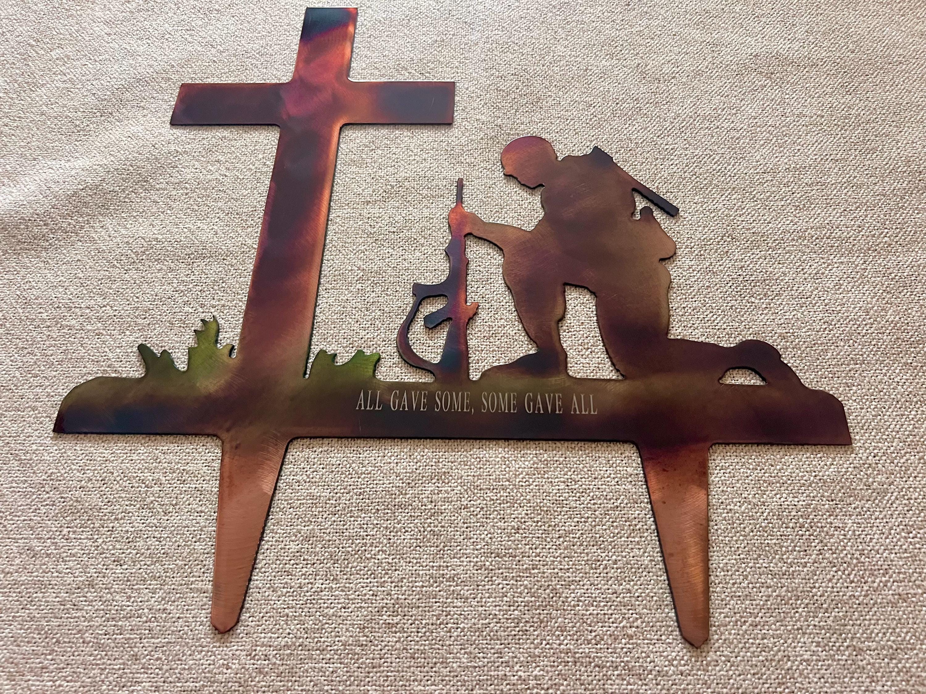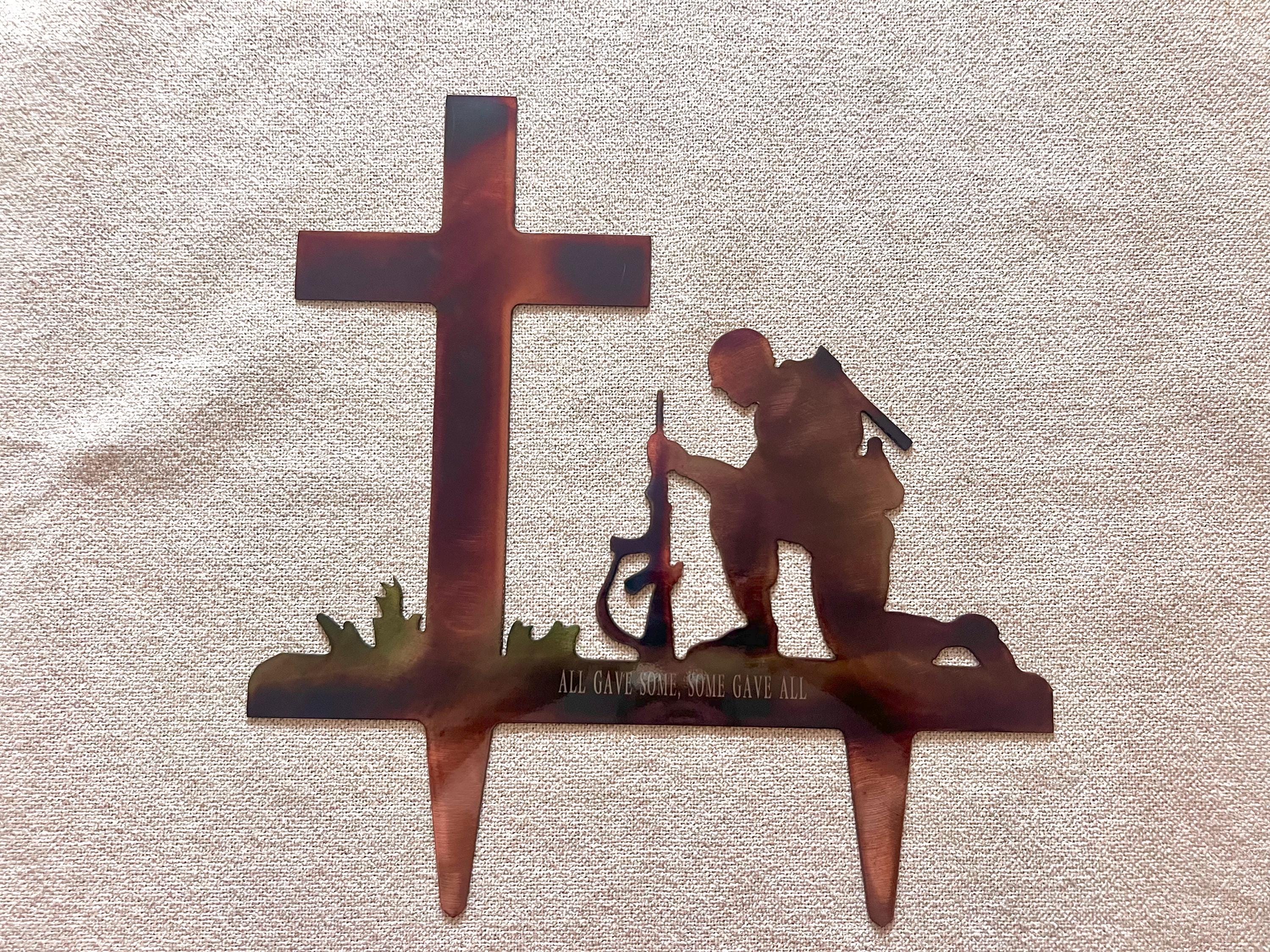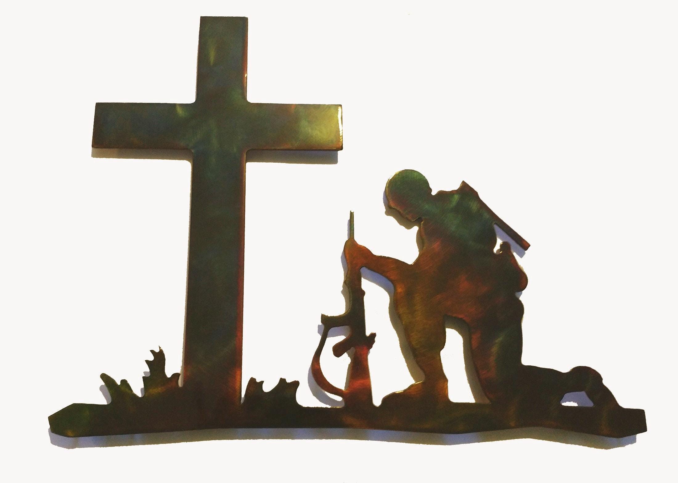 This metal wall art piece features a soldier kneeling in front of the cross of Jesus. Maybe praying for safety as he or she faces the job that lies ahead, or maybe for comfort for family and friends of a fallen friend.