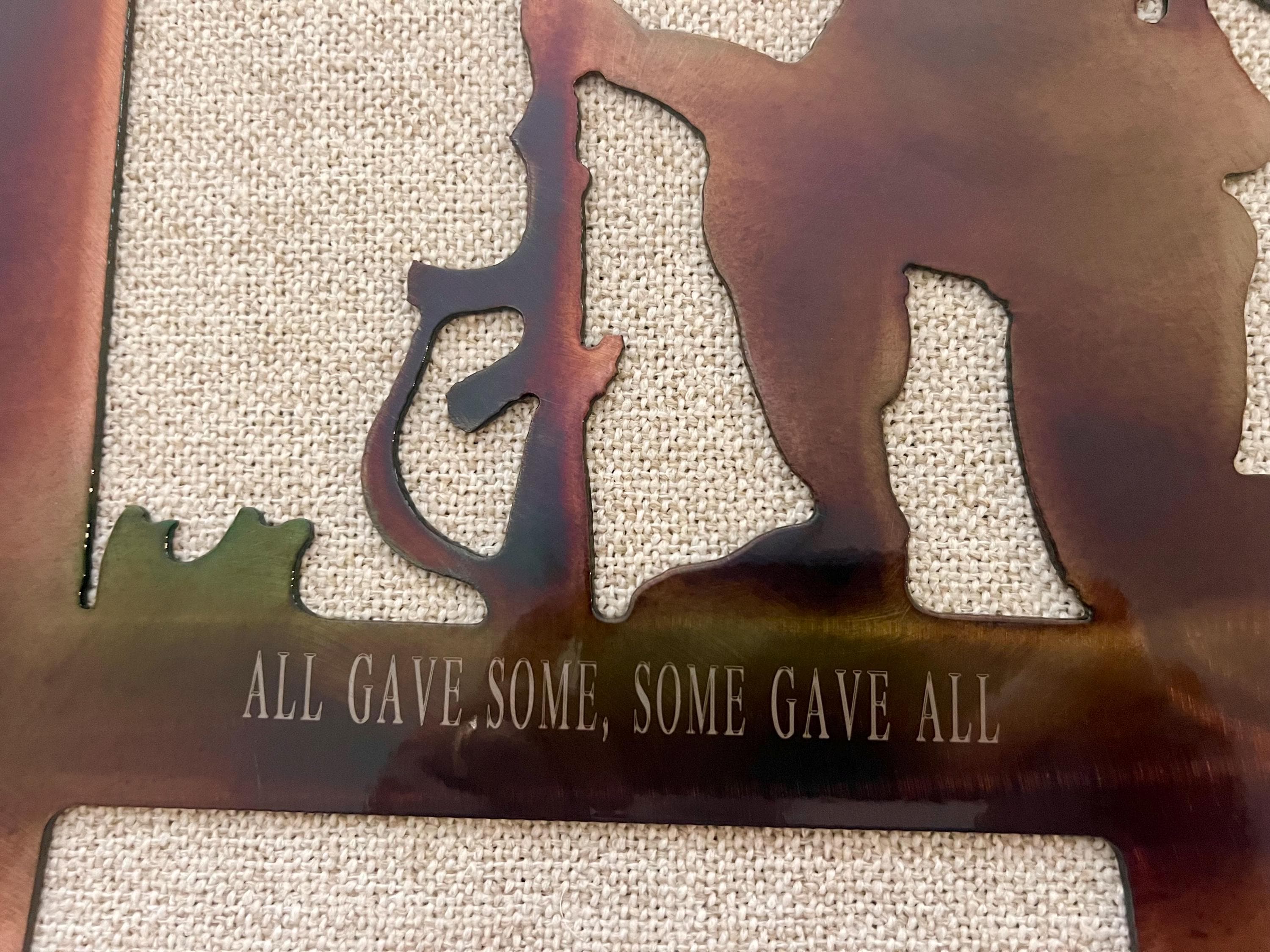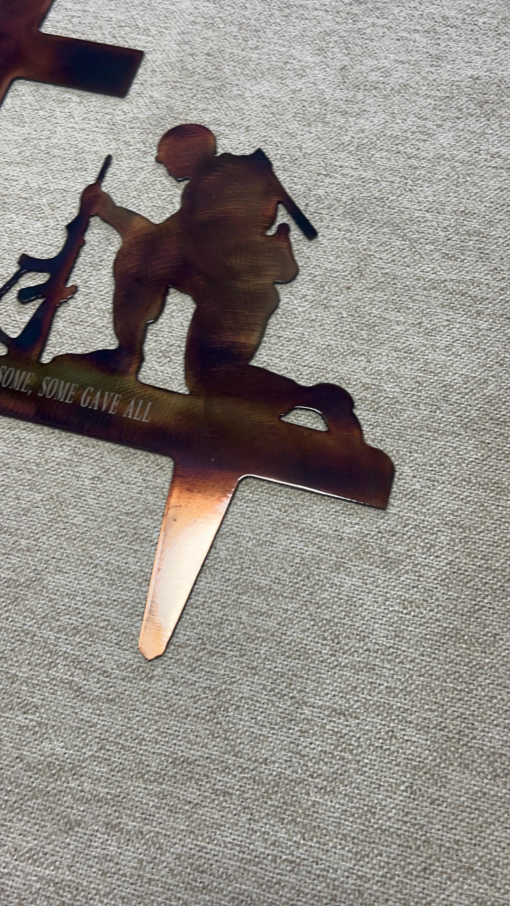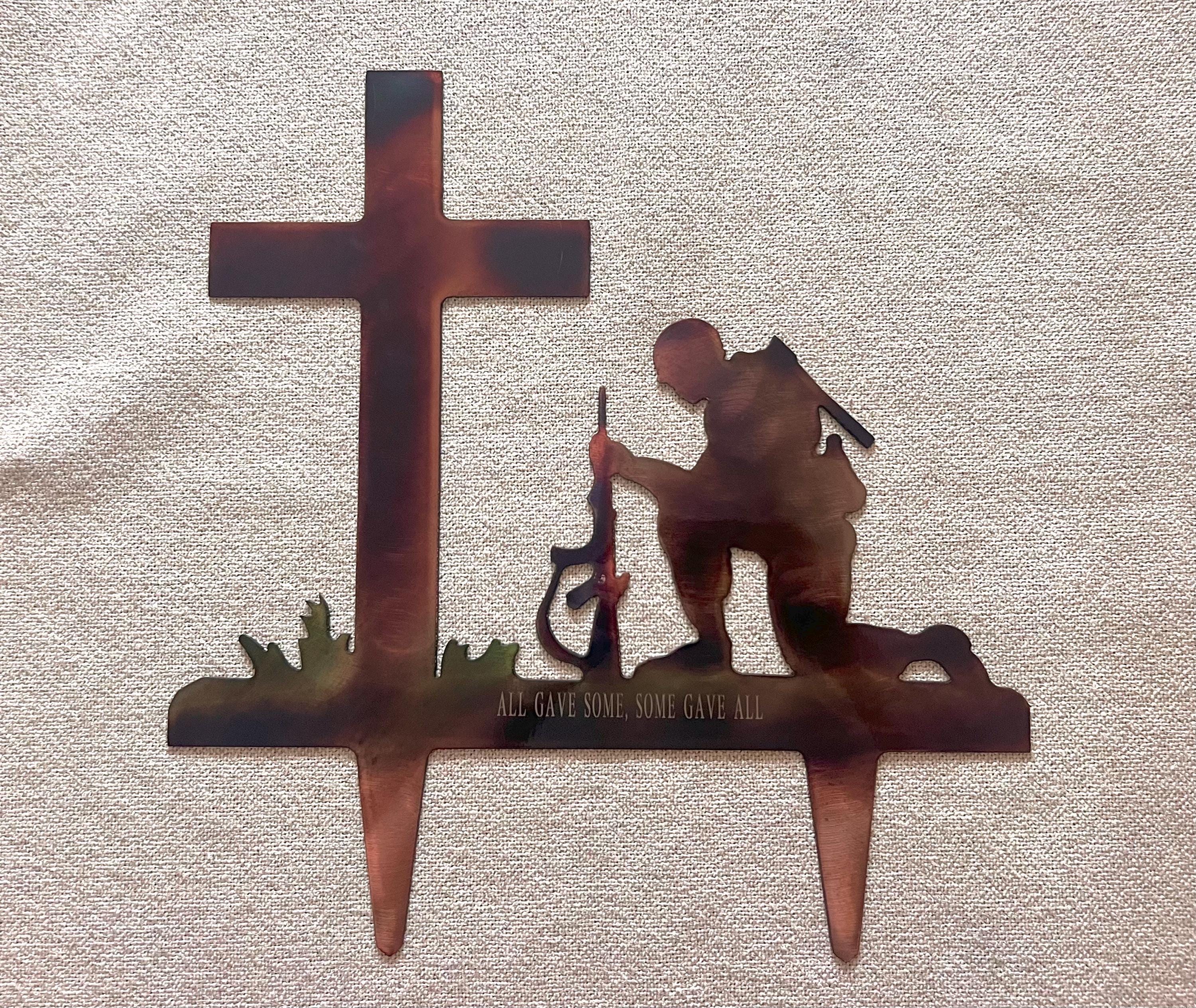 This metal wall art piece features a soldier kneeling in front of the cross of Jesus. Maybe praying for safety as he or she faces the job that lies ahead, or maybe for comfort for family and friends of a fallen friend.