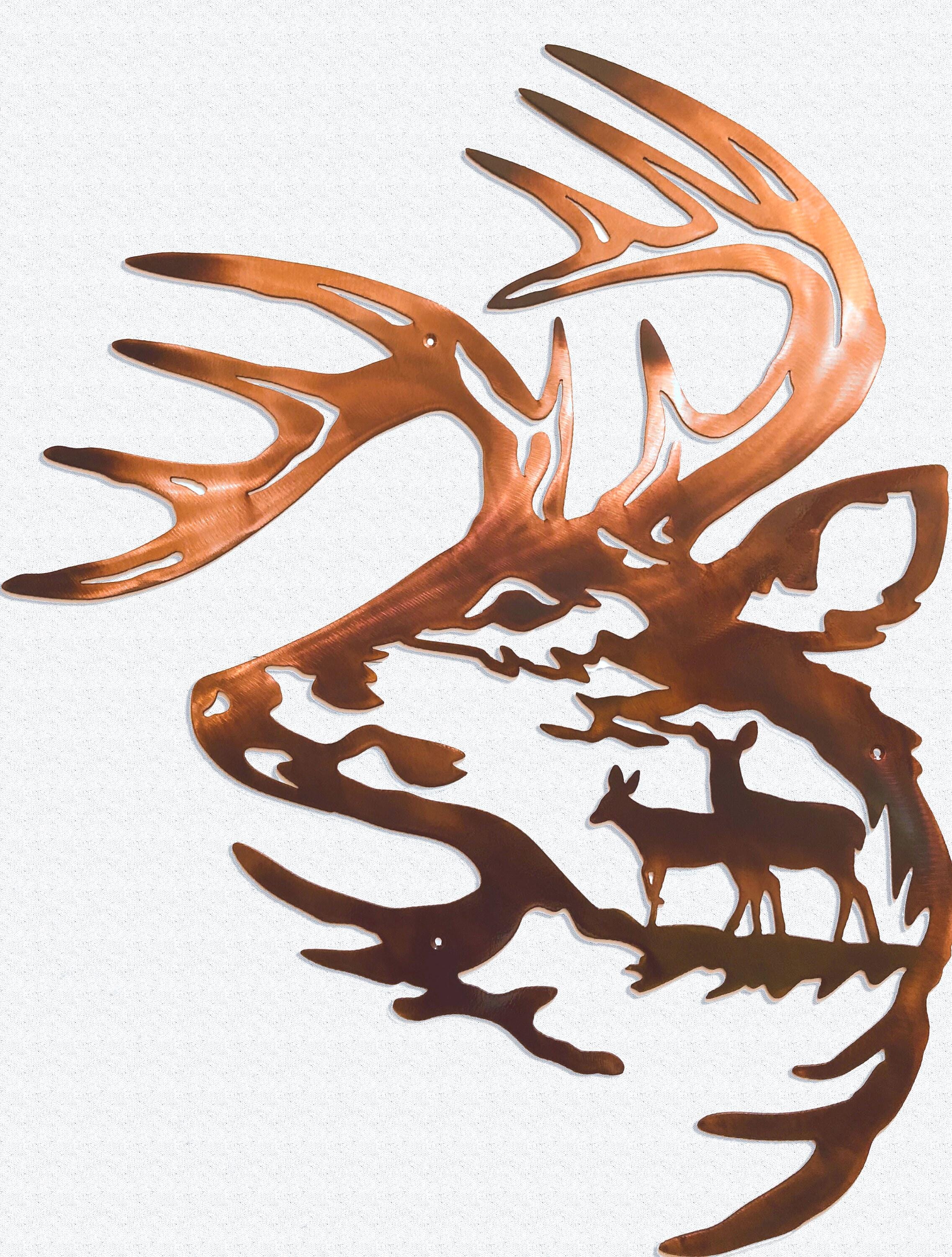 This metal wall art piece depicts a whitetail buck head with doe deer inside. It will make a great addition to your home, man-cave, or hunting lodge decor. The finish is a hand applied patina with a durable clear powder coat to keep the piece looking good for many years hanging indoors or outdoors. The colors will change depending on the intensity, color, and angle of lighting. Made from 14 gauge steel this metal art piece is approximately 26" wide x 32" high.